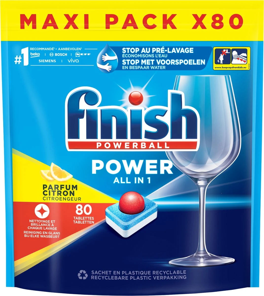 Deze verpakking bevat 80 Finish Power all in one citroen vaatwastabletten.